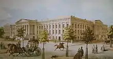 In the aftermath of the fire, the way patents were identified was changed. Previously, patent records were not numbered and could be researched only by the date of patent or inventor's name. After the fire, unique numbers were issued by the Patent Office for each new patent.[15] The Patent Office through the Patent Act of 1836 became its own organization under the United States Department of State. Henry Leavitt Ellsworth became its first Commissioner in 1835. He immediately began construction of a new fire-proof building,[16] that was not completed until 1864.[17] A fire in 1877 destroyed the west and north wing of the new building and caused even more damage.[16]
