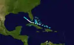 A month after the dissipation of the first hurricane, another tropical storm formed north of Hispaniola on August 13.[2] Ludlum (1963) described the "Key West Hurricane" between August 14 and 16,[7] and it was determined that the system had, in fact, surpassed the threshold for hurricane status based on wind observations from two ships.[3] The storm skirted the north coast of Cuba as it moved west-northwest and passed through the Florida Straits.[2] On or around August 15, Havana, Cuba experienced heavy rainfall.[7] Although the cyclone did not directly make landfall, it delivered hurricane-force winds to southern Florida.[4] It turned more toward the northwest as it entered the Gulf of Mexico, where it began to gradually weaken. It is listed as having dissipated on August 17 in the northern Gulf.[2]