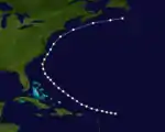 The bark St. Ursula observed a hurricane about 375 mi (600 km) east-northeast of Dominica of July 28.[2] Tracking generally northwestward, the storm changed little in intensity until located to the north of Grand Turk. From there, it proceeded northwestward, and intensified to near Category 1 hurricane status. As it moved to the southwest of Wilmington, North Carolina, the storm attained its peak intensity of 105 mph (165 km/h) and a minimum barometric pressure of 969 mbar (28.6 inHg),[5] based on observations from a ship located about 140 mi (230 km) east of Norfolk, Virginia.[2] Shortly thereafter, the cyclone commenced re-curving to the northeast and began a weakening trend, falling to Category 1 strength by early on August 2. Further weakening occurred while the hurricane was located to the west of Sable Island. The storm was last reported to the south of Cape Race on the island of Newfoundland on August 3.[5]