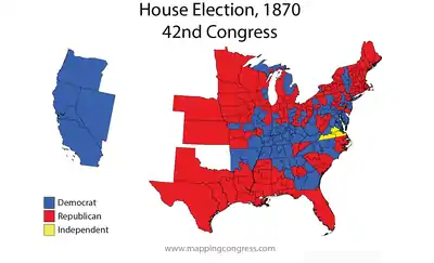 The 1870 United States elections occurred in the middle of Republican President Ulysses S. Grant's first term, during the Third Party System. Members of the 42nd United States Congress were chosen in this election. The election took place during the Reconstruction Era, and many Southerners were barred from voting. It was also the first election after the passage of the 15th Amendment, which prohibits state and federal governments from denying the right to vote on the basis of race, color, or previous condition of servitude (although disenfranchisement would continue). The Republican Party maintained a majority in both houses of Congress, although Democrats picked up several seats in both chambers.
