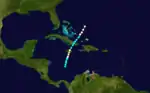 On October 31, a tropical storm developed to the north of Panama. Moving towards the east-northeast, the storm attained hurricane status on November 1, while situated just south of Jamaica. Upon making landfall in the island nation on November 2, the storm strengthened into a Category 2 hurricane with 100 mph (155 km/h) winds, becoming the strongest system of the 1874 season. Reports from Kingston, Jamaica spoke of 17 vessels being wrecked or destroyed by the storm.[8] After crossing Jamaica, the system weakened into a Category 1 hurricane and then further into a tropical storm upon making landfall in eastern Cuba. On November 3, the system emerged in the Bahamas, and strengthened into a hurricane once again the following day. On November 4, the storm was last sighted to the northeast of the Bahamas.[4]