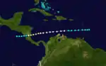 A tropical storm was first observed on September 28 just to the east of the Leeward Islands. It later strengthened into a hurricane as it passed near the Netherlands Antilles. It later peaked as a Category 2 hurricane before making landfall in Nicaragua. The storm reached the Pacific Ocean before it dissipated on October 5.[4] The cyclone severely damaged parts of Central America, inundating the Nicaraguan capital of Managua with floodwaters. People climbed rooftops to evade the floodwaters. On the east coast of the country, 300 homes were destroyed at Bluefields. The ship Costa Rica, in the eastern Pacific and bound for Acapulco on October 4, lost her hurricane-deck as well as the head of her main mast, main topmast, and gaff. She also lost one of her quarter boats and experienced a wind shift at 2030 UTC.[8]