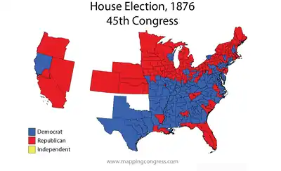 | 1876 presidential election results. Red denotes states won by Hayes, blue denotes states won by Tilden. Numbers indicate the electoral votes won by each candidate. | |