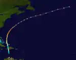 A Category One hurricane was first discovered over 1,000 miles (1,600 km) to the east of the Windward Islands on September 11. After several days it grew to a Category 2 hurricane with winds peaking at 100 mph (160 km/h).The minimum pressure is unknown. It dissipated on September 18 about 350 miles (560 km) to the south-southeast on Bermuda.