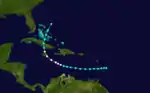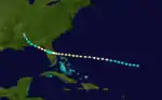The third tropical cyclone and second hurricane of the season developed 75 miles (120 km) northeast of Barbados early on August 15. Pursuing a parabolic path, it headed west-southwest across Saint Lucia,[13] and a ship noted heavy squalls near Guadeloupe.[10] On August 16, the fast-moving tropical storm, then nearing hurricane intensity, turned westward over the eastern Caribbean Sea. At 00:00 UTC on August 18, upon reaching hurricane status, it commenced a northwestward course toward Jamaica.[4] On the same date, the ship Nith registered a pressure of 29.15 inHg (987 mb) in the storm.[2] At 00:00 UTC on August 19, the cyclone peaked with winds of 90 mph (150 km/h), and shortly afterward struck Kingston, Jamaica. While traversing eastern Jamaica, the cyclone weakened, and turned northward to strike Pilón, Cuba, with winds of 80 mph (130 km/h). The storm lost hurricane intensity after landfall, turned to the north-northeast, and swiftly crossed the Bahamas on August 20. The storm was last identifiable at 18:00 UTC, over the southwestern Atlantic Ocean, with winds of 45 mph (75 km/h).[4]