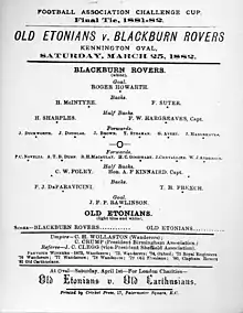 In the final, played at Kennington Oval on 25 March 1882, the Old Etonians met Blackburn Rovers, who were the first team from outside London and the Home counties to appear in an FA Cup Final. Blackburn included England internationals, Fred Hargreaves and his brother, John, and Jimmy Brown.