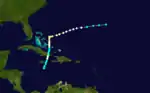 Another tropical storm was first observed by the bark Campero at 00:00 UTC on September 3, while located about 850 mi (1,370 km) northeast of Cayenne, French Guiana.[4][3] Moving west-northwestward, the storm intensified into a Category 1 hurricane on September 5.[3] The brig Comalo was damaged by the hurricane and was leaky and dismasted upon arrival in Saint Thomas, U.S. Virgin Islands.[4] By midday on September 6, the storm strengthened into a Category 2 hurricane. Early the following day, the system further intensified into a Category 3 hurricane while curving northeastward.[3]
