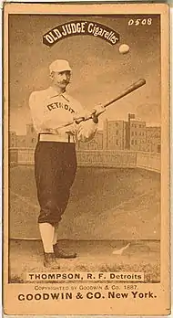 Right fielder Sam Thompson, known as "Big Sam," was the third future Hall of Famer on the 1887 Detroit team. Thompson was in his prime in 1887 and had a tremendous year. He was the National League batting champion with a .372 average, and he also led the league in slugging percentage (.571), hits (203), total bases (311), triples (23), RBIs (166), and runs created (127). His 1887 total of 166 RBIs stood as a major league record for 40 years until Lou Gehrig broke it in 1927. He was No. 2 on the all-time home run list at the time of his retirement.