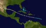 The final storm formed on October 13 and lasted until October 17. The storm was fairly short-lived and mostly maintained its peak intensity as a minimal 40 mph (64 km/h) tropical storm, forming in the Bay of Campeche and curving east-northeast past the tip of the Yucatán Peninsula and making landfall in southwest Florida. It weakened to a depression after moving inland and crossing the southern half of the state, finally dissipating off the southeast Florida coast near the Bahamas.