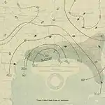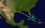 Early on September 25, a tropical storm was spotted about 100 miles (160 km) west of Grand Cayman. It moved slowly northwestward and passed near Cape San Antonio, Cuba early on September 27. The storm then entered the Gulf of Mexico and began strengthening while curving northward.[2] On September 28, the system attained its peak intensity with maximum sustained winds of 45 mph (75 km/h) and a minimum barometric pressure of 1,010 mbar (30 inHg).[3][2] Early on September 29, the storm curved eastward and dissipated several hours later offshore Florida.[2] In Cuba, the storm brought strong winds and heavy rainfall as far east as Havana, causing flooding, "but no great damage".[3]