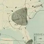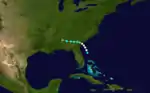 A "feeble" tropical disturbance developed into a tropical storm near West End, Grand Bahama, early on August 2.[1] Three hours later, the storm made landfall in Hobe Sound, Florida, with winds of 40 mph (65 km/h). The system briefly weakened to a tropical depression on August 2, before re-strengthening into a tropical storm and emerging into the Gulf of Mexico near Tarpon Springs. Later that day, the cyclone intensified quickly, becoming a Category 1 hurricane on the modern-day Saffir–Simpson hurricane wind scale at 23:00 UTC. Simultaneously, the hurricane made landfall on St. George Island with winds of 80 mph (130 km/h). After moving inland, it rapidly weakened and dissipated over southwestern Alabama late on August 3.[2]