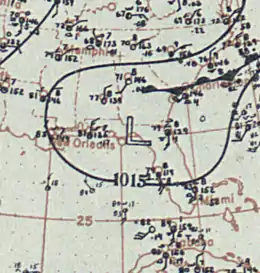 A "violent hurricane" was first observed near the south coast of Hispaniola at 1200 UTC on July 27.[1] Within the next six hours, the storm made landfall in Azua Province, Dominican Republic with winds of 80 mph (130 km/h) – equivalent to a Category 1 hurricane on the modern-day Saffir–Simpson hurricane wind scale. Early on July 28, it weakened to tropical storm while moving northwestward across northern Haiti. A few hours later, the storm emerged into the Atlantic near Port-de-Paix. The system maintained intensity for over 24 hours as it moved northwestward and parallel to the north coast of Cuba. At 1000 UTC on July 30, the storm made landfall in Islamorada, Florida on Upper Matecumbe Key with winds of 45 mph (75 km/h). It weakened slightly and then moved just offshore or struck the mainland portion of Monroe County, Florida. Early on July 31, the storm began to re-strengthen while entering the eastern Gulf of Mexico.[2]