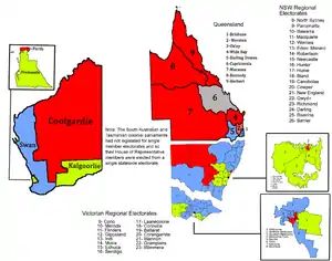 There were 75 House of Representative seats to be filled. The initial number of seats for each state were set out in the Australian Constitution. New South Wales was allocated 26, Victoria 23, Queensland 9, South Australia 7, Western Australia 5 and Tasmania 5. The South Australian and Tasmanian colonial parliaments had not legislated for single member electorates, so their House of Representative members were elected from a single statewide electorate. In South Australia, each elector cast seven votes, while in Tasmania, each elector cast one vote.