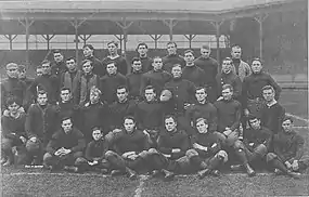 In July 1908, the Western University of Pennsylvania officially became the University of Pittsburgh. Hence, the cheers and songs emanating from the students at sporting contests had to be changed for the 1908 football season.[12] In April, John A. Moorehead was hired to lead the football team for a second season.[13] He hired ex-quarterback Karl Swenson as assistant coach. At the 1907 season ending banquet Quince Banbury was chosen captain by his teammates.[14] The drama in this offseason centered on a request by Washington & Jefferson University's Athletic Committee for the Western University of Pennsylvania to sign an agreement to adopt a one-year residency rule for their athletes. They stated that they would only make this request of the Western University of Pennsylvania. The WUP Athletic Committee declined and severed ties with all Washington & Jefferson athletic teams.[15] Late in November the Red and Black changed their mind and begged for a post season football game with the University of Pittsburgh. The details were worked out between Alexander Silverman, the Graduate Manager of Athletics at Pitt and E. M. Murphy, the Graduate Manager of Athletics at Washington & Jefferson. The University of Pittsburgh Athletic Committee agreed to mend relations with the Red and Black and the eleventh game was added to the schedule. The main plus to come out of the pettiness and then total reversal shown by Washington & Jefferson's Athletic Department was a rivalry played for the next twenty-one straight years.[16] In its second season under head coach John A. Moorehead, the team compiled an 8–3 record and outscored opponents by a total of 140 to 36.[17][18] At the conclusion of the season Mr. Moorehead resigned as coach and went into business with his father.[19]