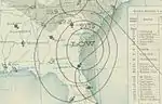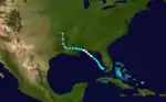 The final storm was first observed as a disturbance near Puerto Rico in the Caribbean Sea in late October.[17] The disturbance was the precursor to a tropical depression which developed over the southern Bahamas and headed west-southwestward across Cuba,[1] where, at Havana, winds blew from the southeast at 44 mph (71 km/h).[17] It became a tropical storm on October 27 and drifted southwestward. Near the eastern tip of the Yucatán Peninsula, the storm turned sharply northward.[1] An area of high pressure over the United States prevented the cyclone from turning eastward toward Florida, and it continued into the Gulf of Mexico. However, on October 31, the storm curved eastward and moved ashore over northern Florida. The storm decreased in intensity as it passed into the Atlantic.[17] The storm's circulation center remained poorly defined throughout its course. It was long believed to have developed south of Cuba, although a reevaluation of ship data indicated the depression had actually formed east of the island.[2] On October 26, the Weather Bureau hoisted hurricane warnings along the east coast of Florida from Key West to West Palm Beach, and on the west coast up to Tampa.[18]