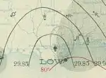 Based on ship observations in the southeastern Gulf of Mexico, a low-pressure area developed north of Key West in early August.[6] It developed into a tropical depression at 12:00 UTC on August 8,[3] and strengthened into a tropical storm at 06:00 UTC on August 9 while moving northwestward off the west coast of Florida.[3] Gradual intensification continued, and at 06:00 UTC on August 11 the storm strengthened to hurricane status.[3] At 22:00 UTC on August 11, the hurricane reached its peak intensity and concurrently made landfall near the border between Alabama and Florida as a small tropical cyclone.[6] During this time, the storm's maximum sustained winds were estimated at 80 mph (130 km/h), making it the equivalent of a Category 1 hurricane on the modern day Saffir–Simpson hurricane wind scale.[3] A lull in the storm accompanied the nearby passage of its eye before conditions once again deteriorated.[7] Although the lowest barometric pressure measured on land was 1007 mbar (hPa; 29.74 inHg) in Pensacola, Florida, the storm's pressure was estimated to be much lower at 982 mbar (hPa: 29.00 inHg).[6] After making landfall, the hurricane weakened and slowly drifted westward, weakening to a tropical depression over Louisiana on August 13, before dissipating over Arkansas by 12:00 UTC the next day.[3]