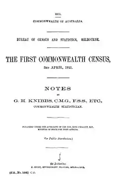 The 1911 Australian census was the first national population census held in Australia. The day used for the census, was taken for the night between 2 and 3 April 1911. The total population of the Commonwealth of Australia was counted as 4,455,005 - an increase of 681,204 people, 18.05% over the 1901 "Federation" Census.[1][lower-alpha 1][2]