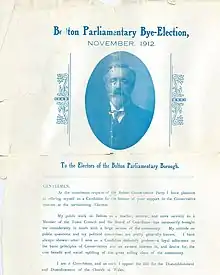 The 1912 Bolton by-election was a parliamentary by-election held for the British House of Commons constituency of Bolton in Lancashire on 23 November 1912. Bolton returned two Member of Parliament to the House of Commons of the United Kingdom, elected by the first past the post voting system.
