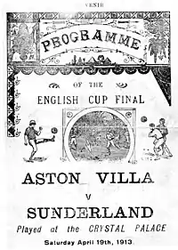 The 1913 FA Cup Final was contested by Aston Villa and Sunderland on 19 April 1913 at London's Crystal Palace. Playing as the home side, Aston Villa won 1–0 on a goal by Tommy Barber on a crossed ball from Charlie Wallace. Wallace had earlier missed a penalty, something that would not occur again in an FA Cup final until the 1988 final between Wimbledon and Liverpool.