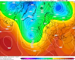 A rapidly deepening low-pressure extratropical cyclone tracked quickly south on the afternoon of 27 October. The central pressure of the system was 990 millibars (29 inHg) at midnight on the 27th,[6] deepening to 975 millibars (28.8 inHg) by 18:00.[7] The low pressure helped to sustain a stream of strong southerly winds, as in days previous,[8] sustaining significantly warmer than average conditions. Temperatures were widely reported over 21 °C (70 °F) in some places.[9] Active weather fronts arriving from the Atlantic Ocean resulted in the instability needed to cause such tornadoes. The low pressure brought cooler air to the country by the 31st.[10]