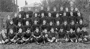 Then Turner entered the game and his first run was 35 yards to the 6-yard line, where Wiggs again scored.[19] The next time he ran 60 yards himself for the touchdown, and the last score came on a 20-yard dash by Cutter Northcutt, Curry's substitute.[20] The victory was overshadowed by a most unfortunate spine injury to Bennett Jared, who died a few months later.[18] The starting lineup was Adams (left end), Cody (left tackle), Williams (left guard), Reyer (center), Putnam (right guard), Lipscomb (right tackle), Cohen (right end), Curry (quarterback), Floyd (left halfback), Zerfoss (right halfback), and Wiggs (fullback).[18]