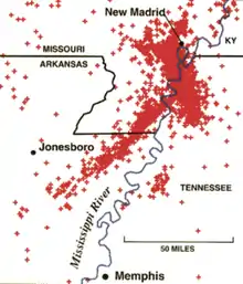 Seismicity in the south–central United States is moderately powerful. The energy from a mid-continent earthquake extends over as much as ten times area of a similarly sized earthquake in the western United States. A magnitude 4.0 earthquake west of the Rocky Mountains reaches up to 60 miles (97 km) from its epicenter, while a magnitude 5.5 earthquake in the eastern US can be felt 300 miles (483 km) from its epicenter.[2] Science failed to explain the phenomena until 1978, when geologists discovered a massive fault line running from the middle of the continent to its eastern coast. More recent magnetic surveys show that the structure is a 500-million year-old strike-slip fault, which starts under the Eastern Tennessee Seismic Zone and runs to the eastern coast. This corresponds to the strike-slip faulting exhibited in the Eastern Tennessee Zone, and explains the presence of mid-continent earthquakes in the United States. Still, it is not clear if the fault is definitely related to mid-continental seismicity.[3]