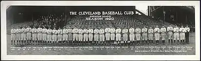 The 1920 Cleveland Indians season was the 20th season in franchise history. The Indians won the American League pennant and proceeded to win their first World Series title in the history of the franchise. Pitchers Jim Bagby, Stan Coveleski and Ray Caldwell combined to win 75 games.[1] Despite the team's success, the season was perhaps more indelibly marked by the death of starting shortstop Ray Chapman, who died after being hit by a pitch on August 16.