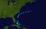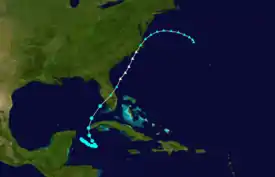 A tropical depression developed near the Yucatan Peninsula early on November 27.[6] The depression drifted southeastward and gradually strengthened into a tropical storm.[6] Once in the gulf, it accelerated and intensified to winds of 65 mph (105 km/h).[10] Early on December 1, the storm made landfall near Fort Myers, Florida, at the same intensity. The system weakened and soon became extratropical. The extratropical cyclone emerged over the eastern Atlantic several hours later and regained hurricane-force winds. By 0000 UTC, the extratropical system peaked with winds of 90 mph (150 km/h) and a minimum pressure of 980 mbar (29 inHg).[6] Around this time, the U. S. S. Patoka, which was in the vicinity of the storm, recorded a pressure of 978.5 mbar (28.9 inHg).[2] The northeastward movement slowed shortly after crossing Florida.[6] Around 2300 UTC, it made landfall between Wilmington and Cape Hatteras[2] with winds equivalent to a minimal hurricane. Shortly after landfall, maximum sustained winds in the storm dropped below 75 mph (120 km/h).[6] A strong area of high pressure located over the Canadian Maritimes caused the system to turn east-southeastward.[2] On December 5, the storm weakened further to the equivalent of a tropical depression as the system began to move towards the south.[6] The remnants of the storm continued eastward, passing several hundred miles north of Bermuda later that day. The cyclone was reported near the Azores on December 9, before finally merging with another cyclone over the North Atlantic.[2]