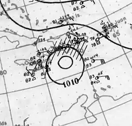 A westward-moving tropical wave developed into a tropical depression while situated near Tobago on August 7. Initially, the storm was considered a "disturbance of slight to moderate intensity". Moving northwestward, the system passed through the Windward Islands just south of Carriacou and Petite Martinique. Upon entering the Caribbean Sea early on August 8, a ship reported winds of 46 mph (74 km/h). As a result, HURDAT indicts that the depression became a tropical storm at 00:00 UTC. On August 9, the storm strengthened into a Category 1 hurricane on the modern-day Saffir–Simpson hurricane wind scale, while located about 155 mi (250 km) south of San Pedro de Macorís, Dominican Republic. At 12:00 UTC on August 10, the cyclone attained its peak intensity as strong Category 1 hurricane with maximum sustained winds with winds of 90 mph (150 km/h) and a minimum barometric pressure of 998 mbar (29.5 inHg). Early on August 9, the storm made landfall in the Tiburon Peninsula of Haiti, based on "belated reports [indicating] that a very small but destructive disturbance passed over extreme southwest Haiti". The quickly re-emerged into the Caribbean Sea later that day.[1]