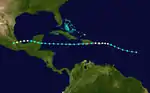 A tropical storm was first noted about 455 miles (730 km) northeast of Barbados around 18:00 UTC on September 8. It intensified on a west-northwest course, becoming a hurricane early on September 10 prior to moving through the U.S. Virgin Islands.[3] The hurricane continued into Puerto Rico – making landfall on the north coast of the island on September 11 – defying initial projections that it would pass safely north.[35] Early on September 12, the storm struck near Punta Cana, Dominican Republic as a minimal hurricane. The cyclone weakened to a tropical storm as it moved south of due west across Haiti, Jamaica, and the western Caribbean. At 19:00 UTC on September 14, it made another landfall north of Belize's border with the Yucatán Peninsula as a strong tropical storm. The cyclone emerged into the Bay of Campeche and quickly strengthened to its peak as a Category 2 hurricane with maximum sustained winds of 100 mph (160 km/h), making a final landfall just east of Veracruz, Veracruz, at 06:00 UTC on September 16 at that intensity. It rapidly weakened once inland and dissipated after 18:00 UTC.[2]