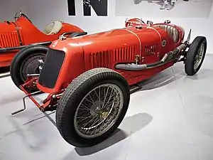 Held in the middle of the racing season, the European Championship was three races run over seven weeks. It started in June with the Italian Grand Prix held at Monza. Running to the new 5-hour AIACR regulations, fifteen cars took the grid. Alfa Romeo unveiled its sensational new model, the Tipo B monoposto, for Nuvolari and Campari, while Borzacchini and Caracciola ran the race-proven 8C-2300. They were supported by two more Monzas, for Scuderia Ferrari's Pietro Ghersi and Eugenio Siena. Maserati gave its 5-litre V5 to Fagioli, and Ruggeri had the 8C model, now bored out to 2.8-litres. Bugatti similarly gave their premier drivers, Varzi and Chiron, the big-engined Type 54 and Divo ran a Type 51. The field was completed with privateers Lehoux and Dreyfus in Bugattis and Castelbarco and Premoli with Maserati.[106] From the start, the race was a close and exciting tussle between the works cars with positions changing constantly. Caracciola was an early casualty losing a quarter-hour with a faulty magneto. Approaching the first hour, after 15 laps, Fagioli had a narrow lead over Nuvolari, followed by Campari and Varzi with Chiron who was only 30 seconds behind in fifth. Over the next half-hour, cars started pitting for fuel and tyre changes. Soon after, Borzacchini now running fourth, was hit in the head by a stone thrown up by a car he was overtaking. He made it back to the pits, bloodied, and was relieved by reserve driver Marinoni. Then Varzi pitted with a ruined transmission. Worse, a lap later, his teammate Chiron crept into the pits. After losing time clearing blocked fuel lines, Varzi took the car back out.[107][54][51] After two hours it was Nuvolari, Campari and Fagioli each 30 seconds apart and a lap ahead of Marinoni, Dreyfus and Siena. But on lap 50 Campari pitted to change tyres and lost 8 minutes when he could not get re-started. An exhausted Fagioli pitted on lap 60 for more tyres and fuel, but spent over 4 minutes stationary before handing over to Ernesto Maserati. Recovered, Fagioli took his car back over again after ten laps. He set some blistering times trying to make up the lost time and gradually reeled in the cars ahead of him to a thrilling finish. But Nuvolari, and his new Tipo B, had not missed a beat. Unlike most others, he drove on without relief to take the victory. Fagioli finished second, a lap behind. Despite behind faster he was stymied by poor pitwork, losing over eleven minutes to the Alfas who pitted for a fraction of that time. A great day for Alfa Romeo was cemented by Borzacchini (assisted by Marinoni and Caracciola) and Campari taking third and fourth with the privateer Bugatti of Dreyfus in an excellent fifth, all on the same lap. Nuvolari's normally shy and retiring wife, Carolina, was asked to anoint him with the winner laurel wreath in front of an ecstatic crowd.[108][54][109]