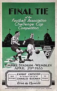 The 1933 FA Cup Final was a football match between Everton and Manchester City on 29 April 1933 at Wembley Stadium in London. The deciding match of English football's primary cup competition, the Football Association Challenge Cup (better known as the FA Cup), it was the 62nd final, and the 11th at Wembley. The 1933 final was the first where the players, including goalkeepers, were issued numbers for identification. Everton were allocated numbers 1–11 and Manchester City numbers 12–22.[1]