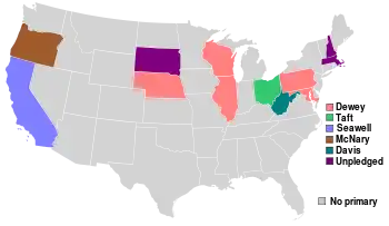 The primaries were contested mainly by Manhattan District Attorney Thomas E. Dewey and Senators Robert A. Taft and Arthur Vandenberg, though only a few states' primaries featured two or more of these men.