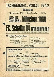 The 1942 Tschammerpokal Final decided the winner of the 1942 Tschammerpokal, the 8th season of Germany's knockout football cup competition. It was played on 15 November 1942 at the Olympiastadion in Berlin.[2] A total of 80,000 spectators watched the match, making it the highest attended German cup final in history. 1860 Munich won the match 2–0 against Schalke 04, to claim their 1st cup title.