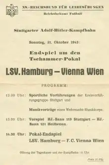 The 1943 Tschammerpokal Final decided the winner of the 1943 Tschammerpokal, the 9th season of Germany's knockout football cup competition. It was played on 31 August 1943 at the Adolf-Hitler-Kampfbahn in Stuttgart.[2] First Vienna won the match 3–2 against LSV Hamburg after extra time, to claim their 1st cup title.