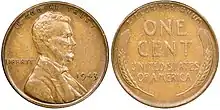 1943 steel cents are U.S. one-cent coins that were struck in steel due to wartime shortages of copper. The Philadelphia, Denver, and San Francisco mints each produced these 1943 Lincoln cents. The unique composition of the coin (low-grade steel coated with zinc, instead of the previously 95%-copper-based bronze composition) has led to various nicknames, such as wartime cent, steel war penny, zinc cent and steelie. The 1943 steel cent features the same Victor David Brenner design for the Lincoln cent which had been in use since 1909.