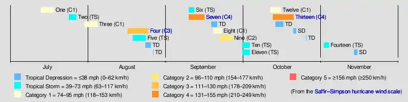 | Seven | September 9 – 15 | Category 4 hurricane | 145 (230) | ≤933 | North Carolina, Mid-Atlantic region, New England, Atlantic Canada | $100 million[7] | 391[7][8] | |||