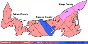 ![]() Map of PEI's ridings coloured in based on how they voted | ||||||||||||||||||||||||||||||||||