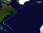 A strong tropical storm, named Able by the Air Weather Service in real time,[11] was first identified on August 26 about 300 mi (485 km) northeast of Saint John, as ship reports indicated winds of Force 9. However, it is likely that Able formed much farther east, possibly as a Cape Verde-type hurricane. The tropical cyclone quickly intensified to a hurricane, and it continued to steadily progress northwest. The storm strengthened into a Category 2 hurricane on August 27, and while turning west-northwestward it continued to intensify. The cyclone peaked as a 120 mph (195 km/h) Category 3 hurricane by 1800 UTC on August 28,[1] which was measured by a reconnaissance aircraft flight.[6] Its forward motion slowed on August 29, and it began to weaken as it turned to the north on August 30. The tropical system weakened to a minimal hurricane, and it accelerated to the northeast on August 31. The storm soon became extratropical before striking southern Newfoundland on September 2. Over the next several days, the system slowly weakened, and its remnants turned east before dissipating south of southern Iceland on September 5.[1]