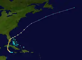 A broad area of low pressure in the central Caribbean Sea developed into a tropical depression early on May 22. The circulation moved northward, and it made landfall in southwest Haiti around 1200 UTC with winds of 35 mph (56 km/h).[1] Over the next day, the system crossed Hispaniola and the Turks and Caicos Islands with winds unchanged. Turning to the northeast, it strengthened into a tropical storm at 1200 UTC on May 24 while over the southwest Atlantic. Shortly afterward, the tropical cyclone turned to the north. On May 25, the storm's forward motion slowed to a crawl; within a few hours, the storm attained its estimated peak intensity of 50 mph (80 km/h), as reported by reconnaissance aircraft, though no ships reported gale-force winds.[6][1][8] The next day, the cyclone started to weaken, and on May 27, the system began to accelerate northward. The system diminished to a tropical depression on May 29 shortly prior to dissipation.[1]