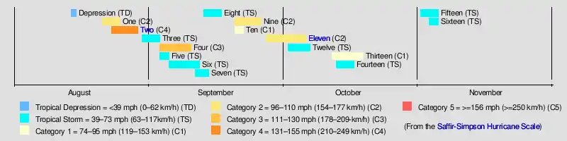 The 1949 Atlantic hurricane season was the last season that tropical cyclones were not publicly labeled by the United States Weather Bureau.[1] It officially began on June 15, and lasted until November 15. These dates conventionally delimit the period of each year when most tropical cyclones form in the Atlantic basin. The first storm, a tropical depression, developed in the northern Gulf of Mexico on August 14. The final system, Tropical Storm Sixteen, dissipated in the southwestern Caribbean Sea on November 5. It was a fairly active season, featuring 16 tropical storms and seven hurricanes. Two of these strengthened into major hurricanes, which are Category 3 or higher on the Saffir–Simpson hurricane wind scale.[2]