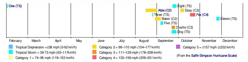 The 1952 Atlantic hurricane season was the last Atlantic hurricane season in which tropical cyclones were named using the Joint Army/Navy Phonetic Alphabet. It was a near normal Atlantic hurricane season, although it was the least active since 1946.[1] The season officially started on June 15;[2] however, a pre-season unnamed storm formed on Groundhog Day, becoming the only storm on record in the month of February. The other six tropical cyclones were named using the Joint Army/Navy Phonetic Alphabet, the first of which formed on August 18. The final storm of the season dissipated on October 28, two and a half weeks before the season officially ended on November 15.[3]