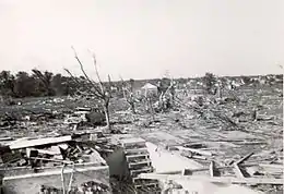While most of the tornado's 18.6-mile-path (29.9 km) went through rural farmland, most of the devastation was concentrated in the Beecher district.[2] 113 of the 116 fatalities from the tornado occurred in Beecher, including 54 children under the age of 18 with multiple deaths occurring in 20 families. The two greatest losses were exacted to the families of Pedro Gatica and Thomas Gensel; both men survived, but lost their entire families. Gatica, a worker at General Motors, had been at work when the tornado struck, while his small home was directly in the path of the storm. His wife Cecilia, who was eight months pregnant with their third child, was killed, as were their two small children and a niece who lived with them.[10] Gensel had been at home with his wife Vanessa and their four children when their home was blown apart; only Thomas survived.[11] Eight area hospitals, including three in Saginaw, were involved in treating victims.[1] Some accounts recalled employees of Flint's automobile industry leaving factories to head to the site to discover whether or not their families had survived.[7] Large sections of neighborhoods were completely destroyed. It was the last tornado to kill more than 100 people until it was surpassed by the Joplin, Missouri, tornado on May 22, 2011. The last F5 tornado in Michigan was the Hudsonville-Standale tornado of April 3, 1956.[1] It was debated in the U.S. Congress at the time whether recent atomic bomb testing in the upper atmosphere had caused tornadoes including this one. Congressman James E. Van Zandt (R-Penn.) was among several members of Congress who expressed their belief that the June 4th bomb testing created the tornadoes, which occurred far outside the traditional tornado alley. They demanded a response from the government. Meteorologists quickly dispelled such an assertion, and Congressman Van Zandt later retracted his statement.