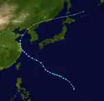 Typhoon Marie had a minimum pressure of 956 mb and a maximum windspeeds of 85 mph. Marie crossed the southern islands of Kyūshū and Shikoku before turning northeast and striking Hokkaidō island. Marie caused the ship Toya Maru to sink in the Tsugaru Strait. 1,361 people were killed and 400 were left missing.[4] Due to this disaster, the typhoon is known in Japan as the Toya Maru Typhoon.[5]