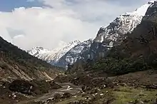 The route passed through a tropical afforested region to Dhankuta then went via Legua Ghat and on north beside the Arun river. Approaching the village of Num the Arun gorge was so deep the track had to leave the line of the river.[note 9] At Num their trail had to cross the river on a 61–76-metre (200–250 ft) rope bridge 15 metres (50 ft) above the water – the bridge had been repaired specially for them. Now able to see Makalu, they passed through the last inhabited places of Etane and Sedoa.[38][note 7] The little village of Sedoa, set on the side of a mountain at 1,600 metres (5,200 ft) and far from the road north to Tibet, was where the Biratnagar porters were paid off after nine days' march.[39][40] In turn 100 men from Sedoa were hired for the onward carry. It was here that mountaineering equipment was issued to replace lightweight clothing.[41]