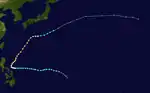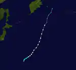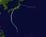 Tropical Storm Alice developed on July 14 in the open western Pacific Ocean. It moved to the northwest and attained typhoon status on the 16th. Alice rapidly intensified on the 19th to a 150-mile-per-hour (240 km/h) super typhoon, and after turning to the northeast it weakened. Alice hit southeastern Japan on the 22nd, and became extratropical on the 24th near the Kamchatka Peninsula.[4]