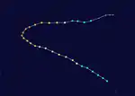 At noon on December 31, a vortex was noted along the Intertropical Convergence Zone about 1,300 miles (2,100 km) south of Hawaii. On January 7, the relatively small tropical storm struck Jaluit Atoll within the southern Marshall Islands, killing 14 people. It rapidly intensified, and reached winds of 140 miles per hour (230 km/h) the next day. Conditions became unfavorable, and steadily weakened to 105 miles per hour (169 km/h) winds. Ponape was struck on January 10, where Ophelia tore off the roof of the United States Weather Bureau office. On January 11, Truk was struck. The Weather Bureau's inflation shelter was destroyed, with other buildings on site severely damaged. On the 12th, favorable conditions allowed Ophelia to reintensify, reaching a peak of 160 miles per hour (260 km/h) on the 13th. Ophelia severely impacted Yap, removing the Weather Bureau office's sheet metal roof and damaging the inflation building, theodolite, and radio antenna.[1] After maintaining that intensity for 18 hours, it quickly weakened as it drifted northward, and dissipated on the 17th. Typhoon Ophelia caused widespread on several islands of the Western Pacific.[2] Ophelia also killed nine people when a USAF WB-50 crashed during a recon flight into the storm on January 15.[3]