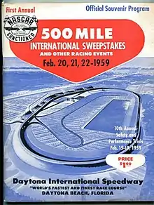 The 1959 First 500 Mile NASCAR International Sweepstakes at Daytona[2] (now known as the 1959 Inaugural Daytona 500) was the second race of the 1959 NASCAR Grand National Series season. It was held on February 22, 1959, in front of 41,921 spectators.[3] It was the first race held at the 2.5-mile (4.0 kilometer) Daytona International Speedway.[4]