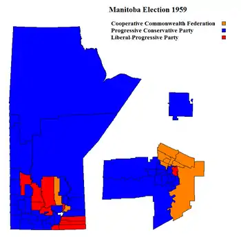Roblin's Tories won 36 seats against 11 for the Liberal-Progressives, led by former Premier Douglas Campbell, and 10 for the social democratic Co-operative Commonwealth Federation led by Lloyd Stinson. The Tories took 25 percent more votes than it had received in the previous election just one year beforenbut took 40 percent more seats than it had won in 1958. They had won 117,822 votes in 1958, compared to 147,000 in 1959.[1]