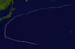 The Japan Meteorological Agency's "best track" does not give windspeeds, only indicating that Patsy was a typhoon.[9] The Joint Typhoon Warning Center's report disagrees on location but also has Patsy's maximum windspeed east of the dateline;[7] the JMA's data does not indicate windspeeds.[9] Patsy is an uncommon west-to-east crosser of the dateline. Including only systems recognized by the Central Pacific Hurricane Center, that has only happened six times since.[10]